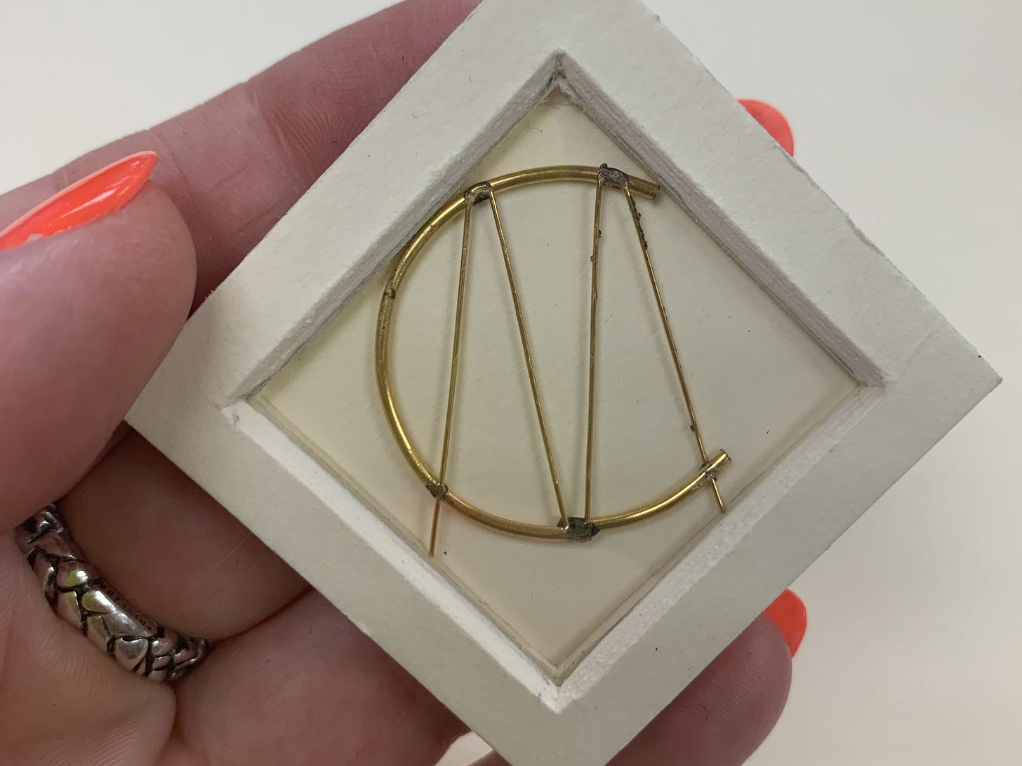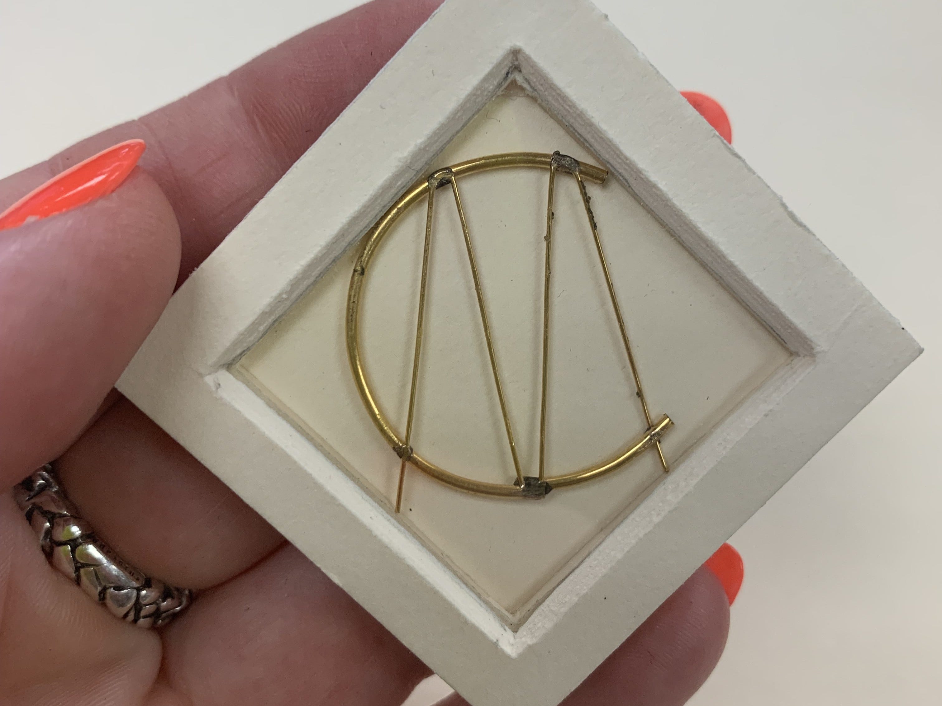 The minimal and mysterious description of the “metal object” had the opposite effect— I was immediately interested. “’M’ (for Miriam) and a ‘C’ (for Charlotte) soldered together, undated.” When I opened the clamshell archival box, tucked next to the scroll, I found a flat 2 x 2-inch custom archival box with a clear window. Inside was a gold-hued—just as the description noted—metal object with the intertwined letters M and C. At first glance, I could tell the metal was something less precious because of the discoloration around the visible solder. Because of the construction of the box, I could also tell there was no pin back, or an obvious function for the object. And that was it. No other information about where it came from, what it was, or why it was saved with their papers.